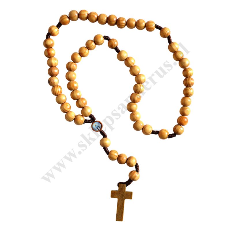 Drewniany różaniec na sznurku o długości 47 cm i średnicy koralika ok. 1.2 cm.