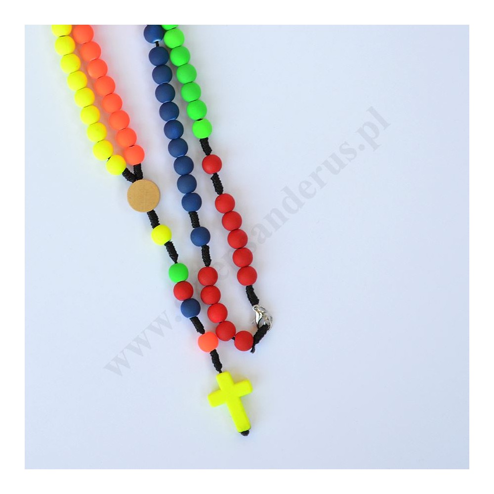 Różaniec drewniany na sznurku o długości ok. 35 cm i średnicy koralika ok. 7 mm.