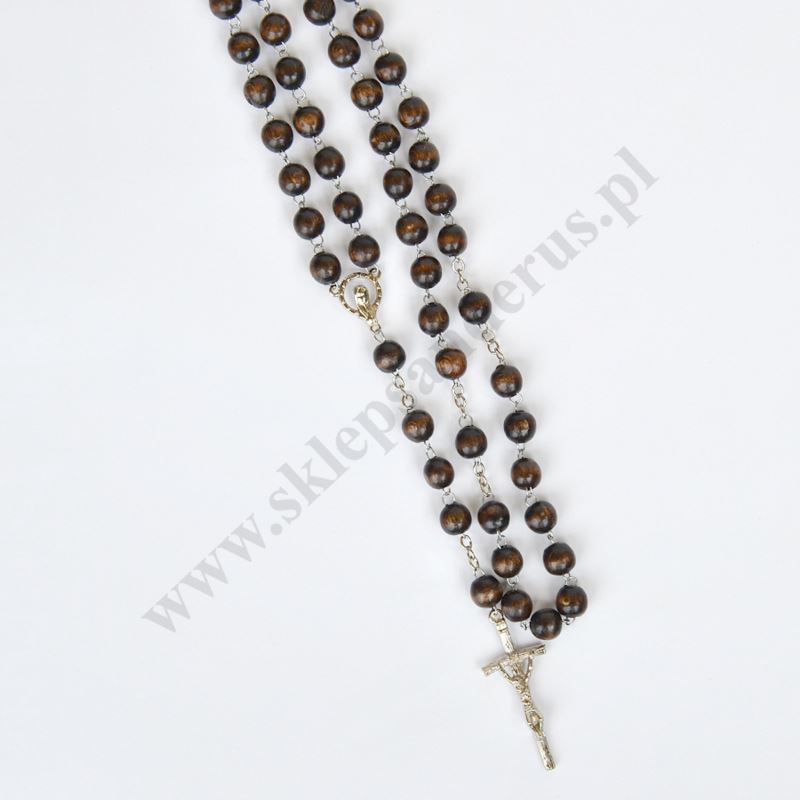 Drewniany różaniec o długości 56 cm i średnicy koralika 8 mm.