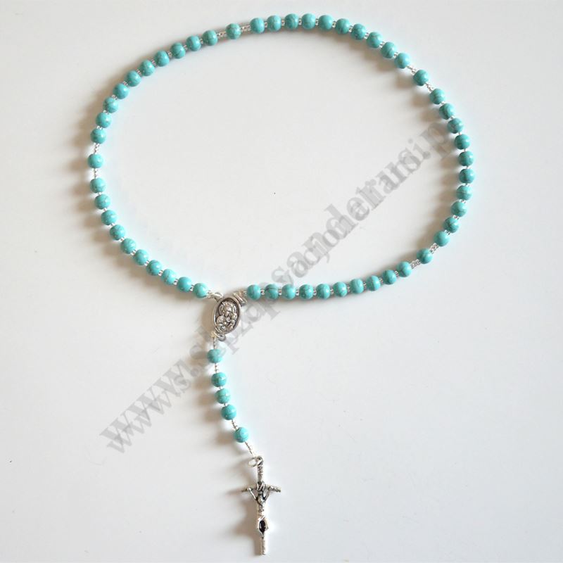 Różaniec, którego koraliki wykonane są z kamienia półszlachetnego howlit turkusowy, krzyżyk oraz łącznik metalowe. Długość różańca 31 cm, średnica koralika 5 mm.