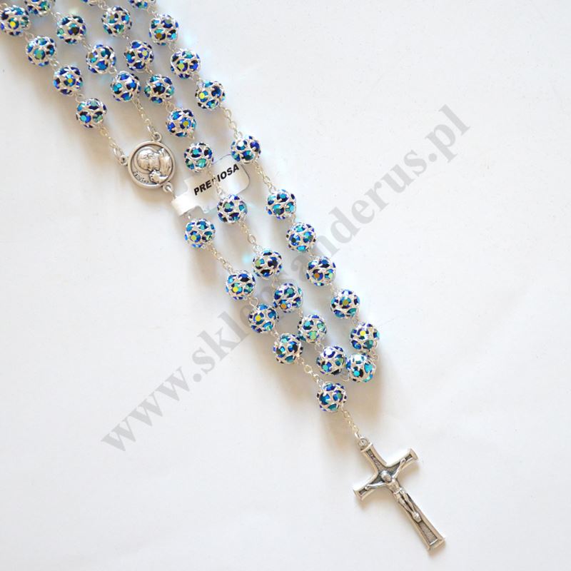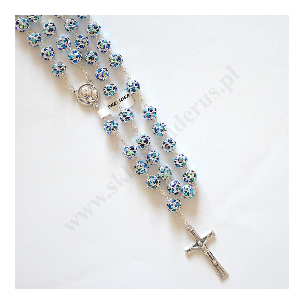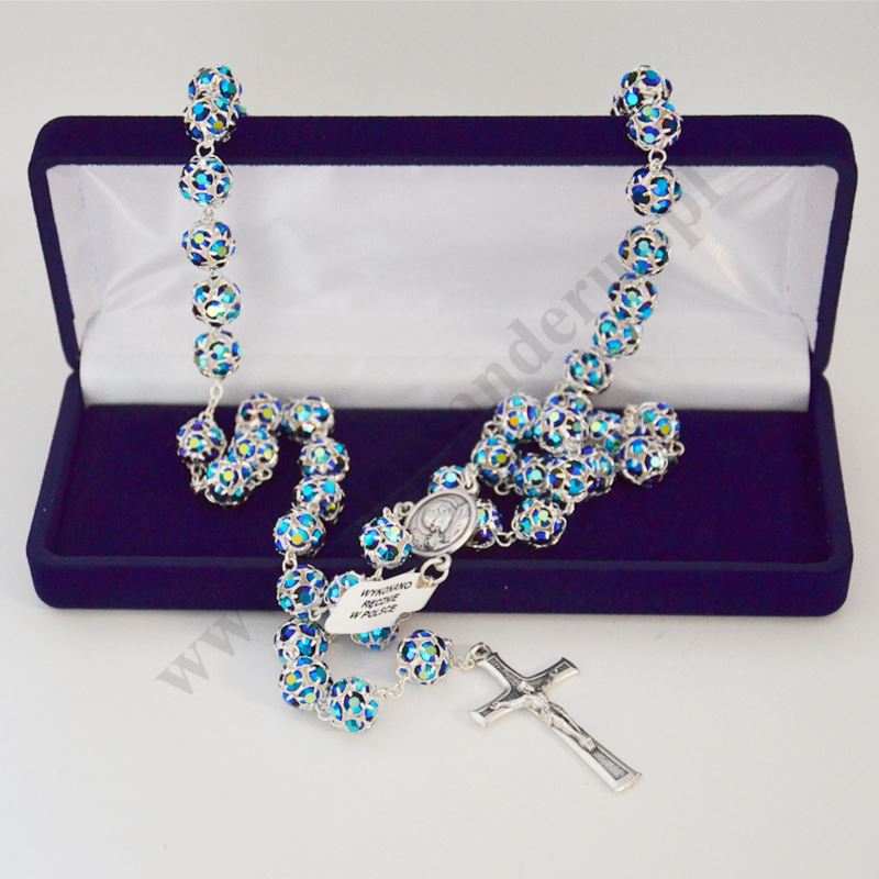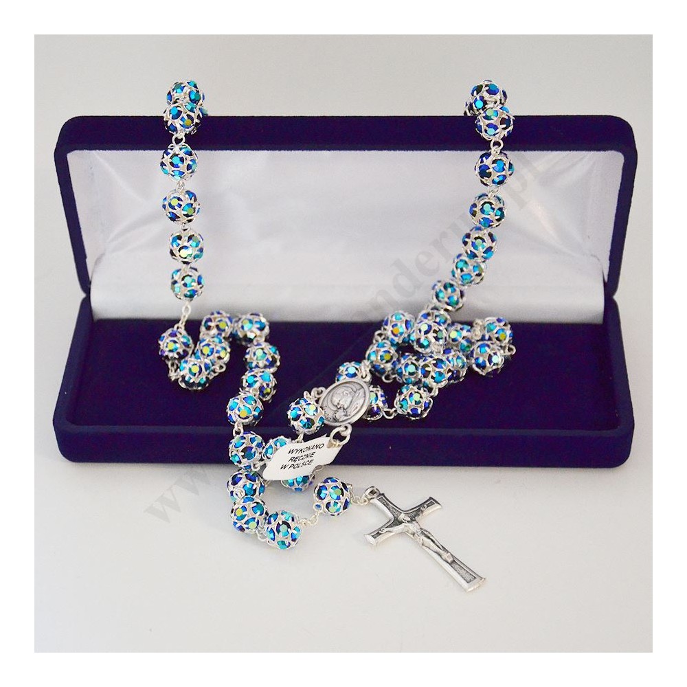 Różaniec wykonany z kamyczków Swarovskiego. Długość różańca ok. 55 cm, średnica koralika ok. 9 mm. Różaniec zapakowany w eleganckie zamszowe pudełko.