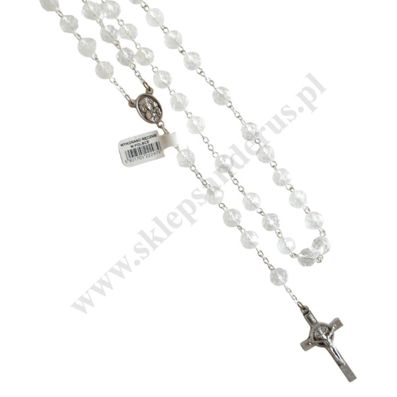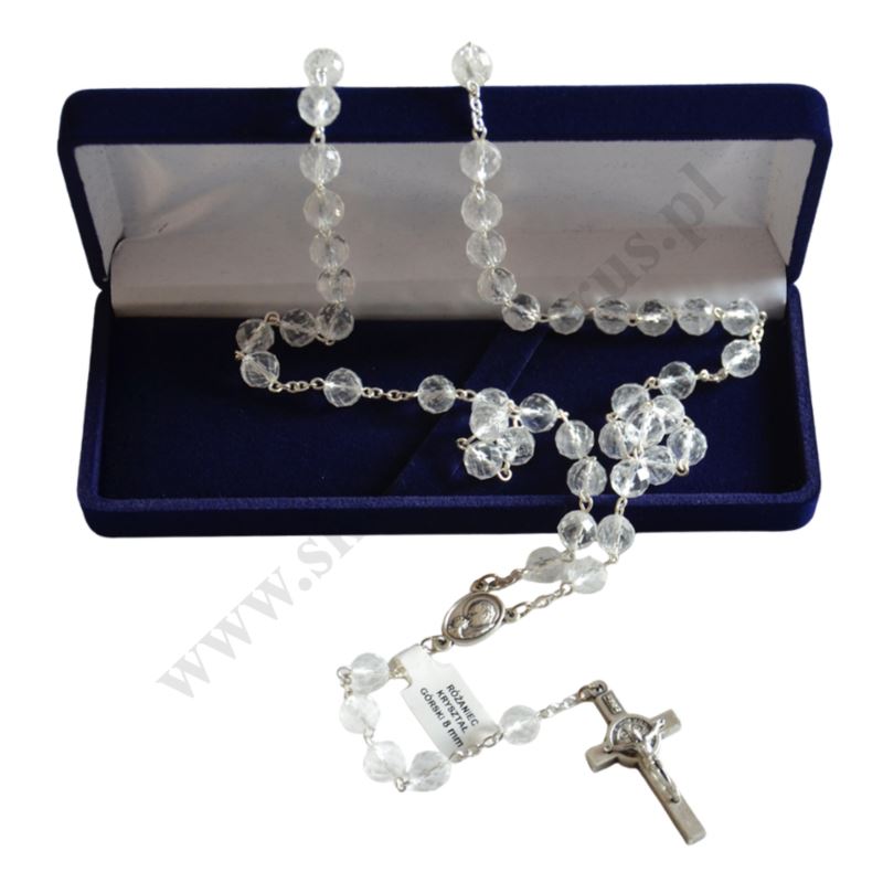 Różaniec wykonany ze stali nierdzewnej oraz kamienia jubilerskiego kryształ górski. Długość różańca 53 cm, średnica koralika 8 mm. Różaniec w eleganckim pudełku wykonany ręcznie w Polsce.