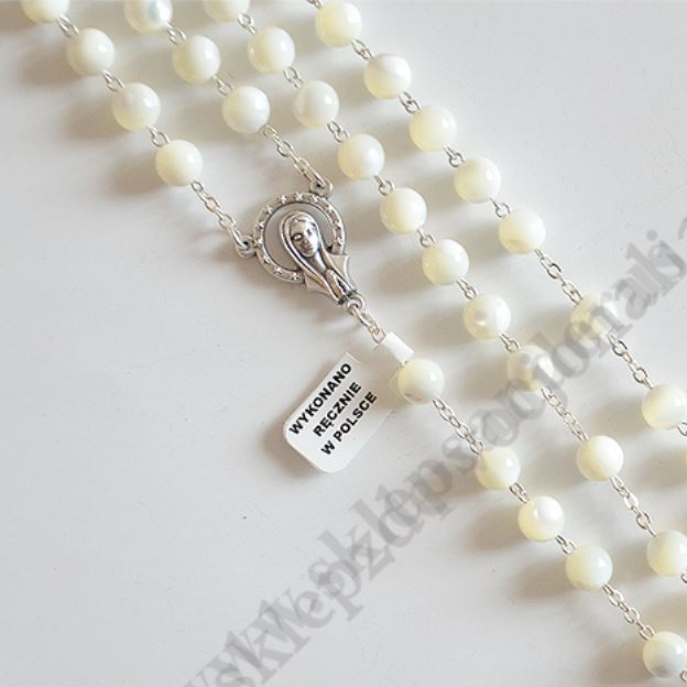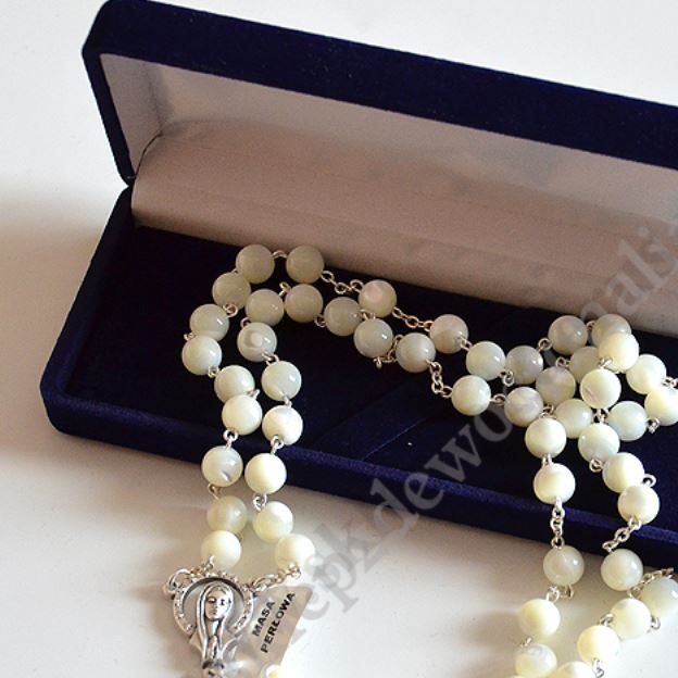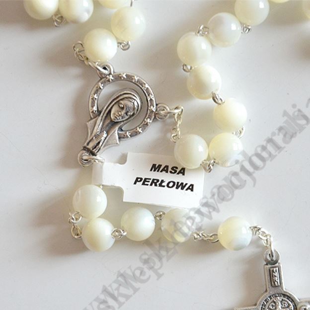 Różaniec w etui wykonany z masy perłowej. Długość różańca 52 cm, średnica koralika 8 mm. Krzyżk Świętego Benedykta, łącznik maryjny z wizerunkiem na rewersie Serce Pana Jezusa.