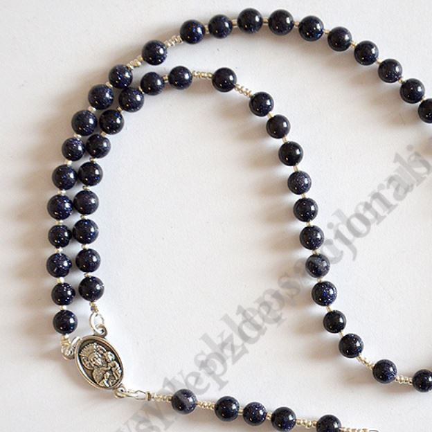 Różaniec wykonany na metalowej lince, krzyżyk oraz łącznik metalowe, koraliki wykonane z kamienia naturalnego - noc kairu. Średnica koralika ok. 6 mm, długość różańca ok. 33 cm.