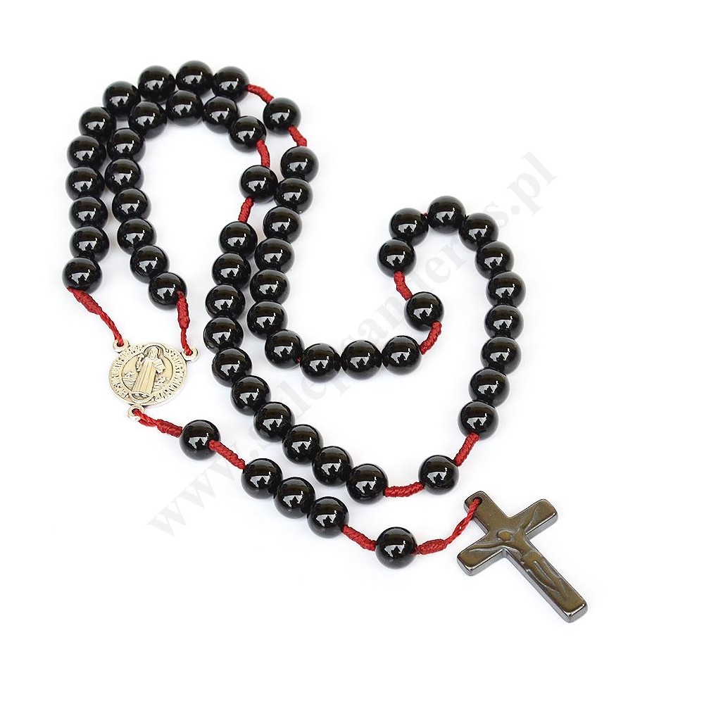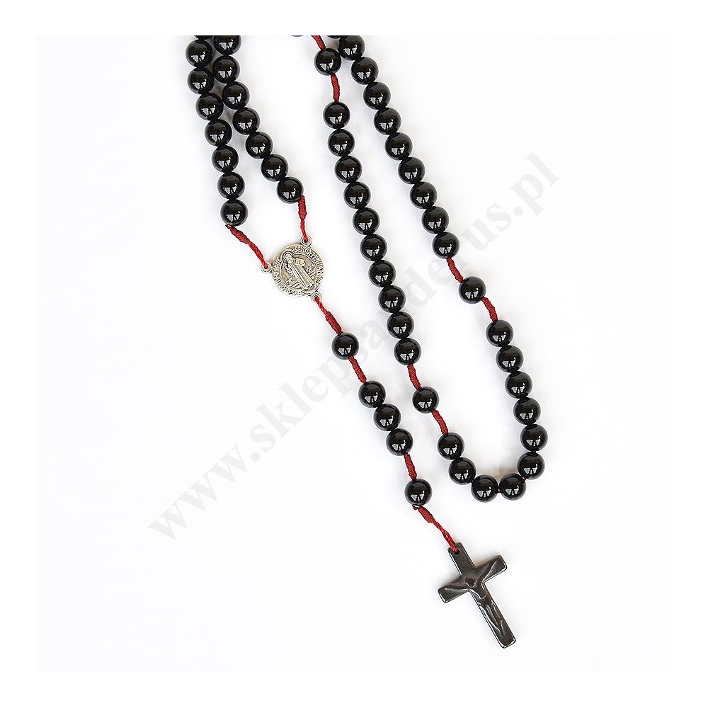 Różaniec na sznurku wykonany z kamienia naturalnego onyks, łącznik wykonany z metalu, długość różańca 40 cm, średnica koralika ok. 8 mm.