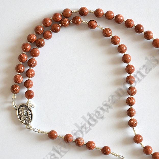 Różaniec wykonany na metalowej lince, krzyżyk oraz łącznik metalowe, koraliki wykonane z kamienia naturalnego - piasek pustyni. Średnica koralika ok. 6 mm, długość różańca ok. 32 cm.