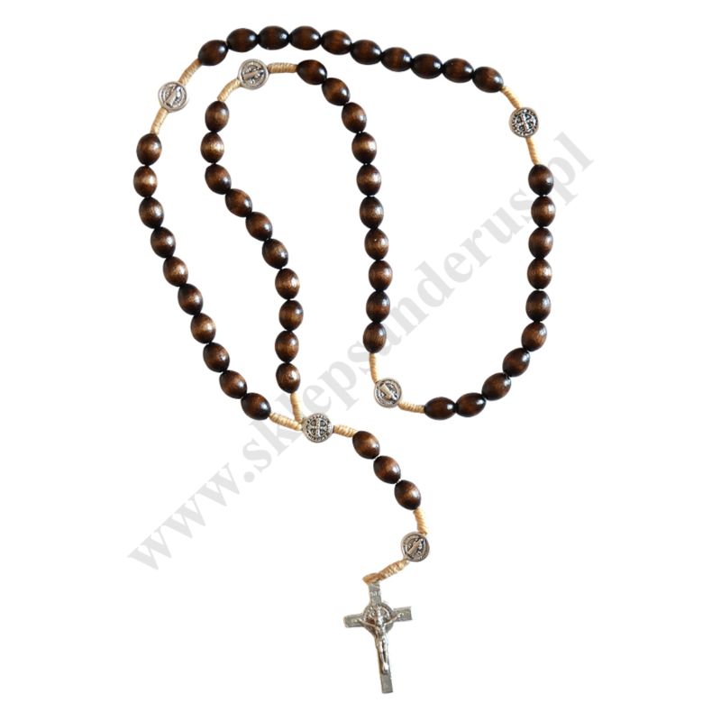 Różaniec Świętego Benedykta drewniany na sznurku o długości 41.5 cm, rozmiar koralika 9 x 7 mm.