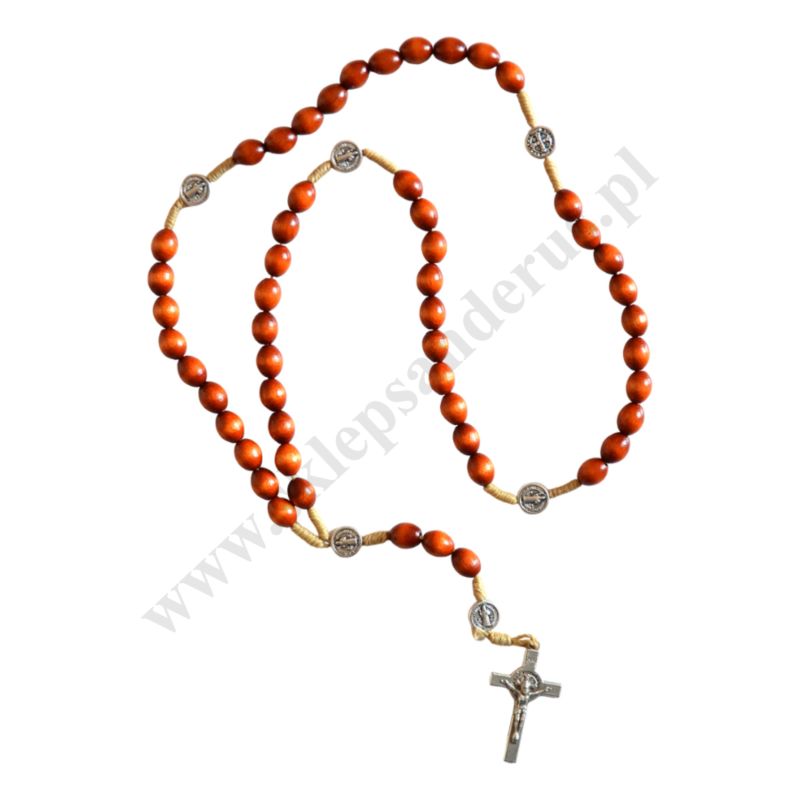 Różaniec Świętego Benedykta drewniany na sznurku o długości 41.5 cm, rozmiar koralika 9 x 7 mm.