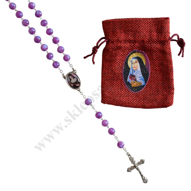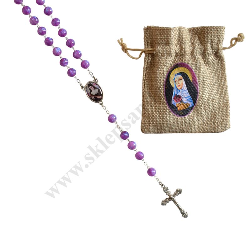 Różaniec Świętej Rity z relikwiami Świętej Rity w eleganckim woreczku z wizerunkiem Świętej Rity. Długość różańca ok. 49 cm, średnica koralika ok. 8 mm.