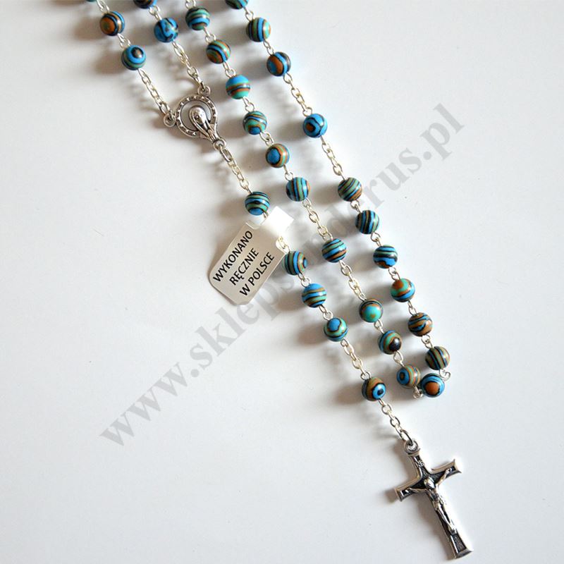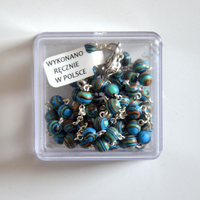 Różaniec wykonany z kamienia półszlachetnego turkus afrykański. Długość różańca 44 cm, średnica koralika 5 mm. Różaniec w plastikowym pódełeczku.