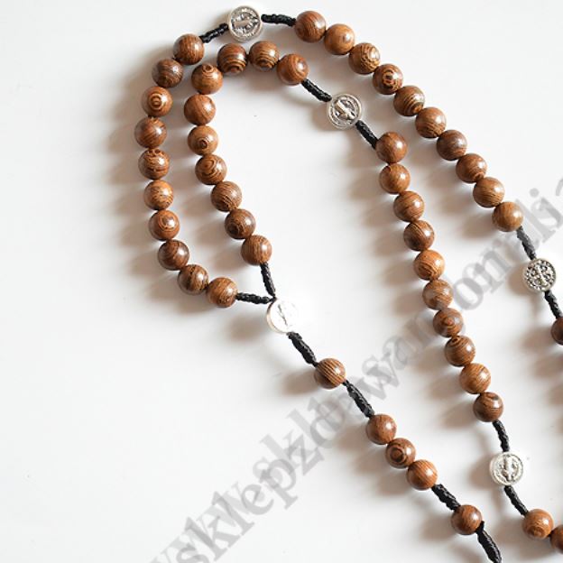 Różaniec wykonany z drewna wenge na sznurku o długości ok 40 cm, średnica koralika 8 mm. Metalowe elementy najwyższej jakości wykonane we Włoszech. Produkt wykonany ręcznie w Polsce.