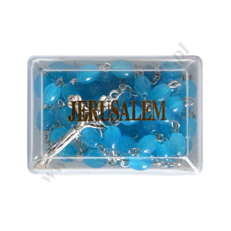 Różaniec wykonany z tworzywa sztucznego i metalu w łączniku umieszczona ziemia święta. Długość różańca ok. 58 cm, rozmiar koralika 8 x 6 mm. Różaniec w plastikowym pudełeczku.