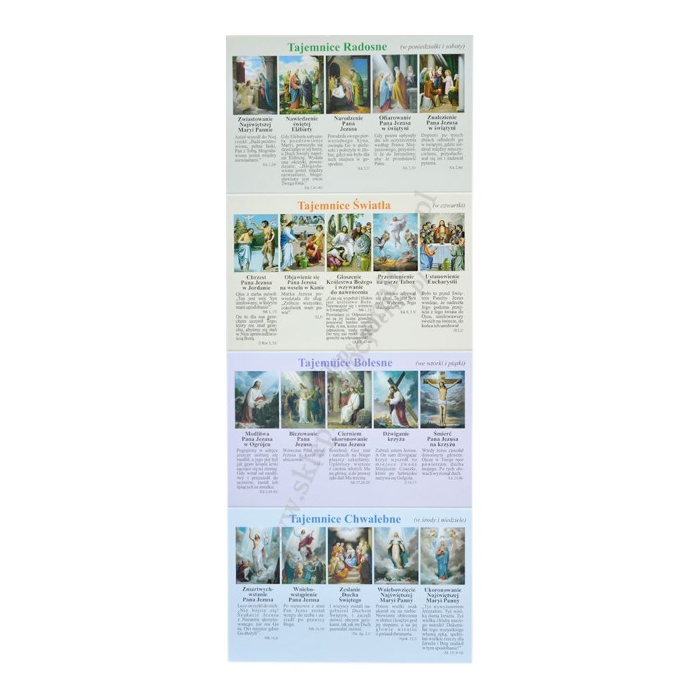 Tajemnice różańca w postacji składanki na trzy, po złożeniu format 10.5 x 16 cm.