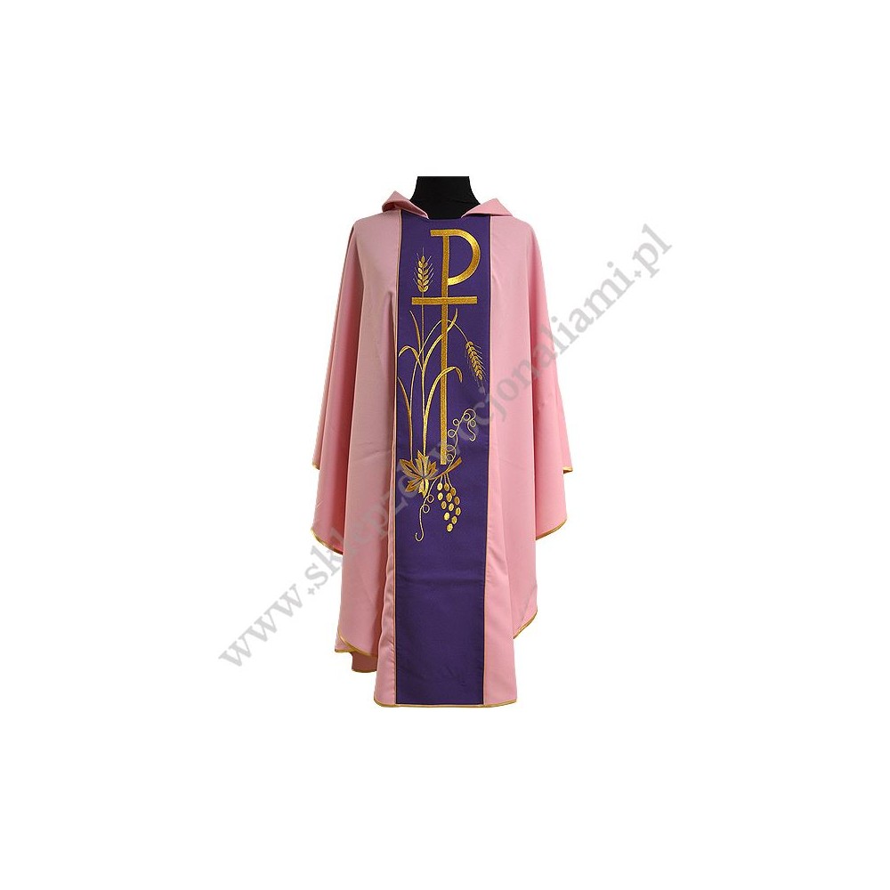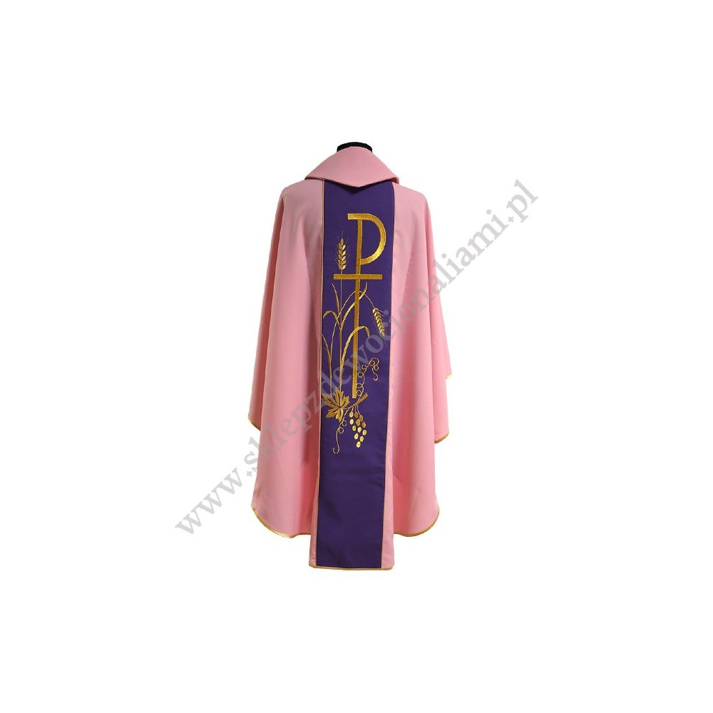 Ornat z pasami haftowanymi komputerowo. Wykonany z lekkiego i przyjemnego w dotyku materiału. W komplecie stuła wewnętrzna.