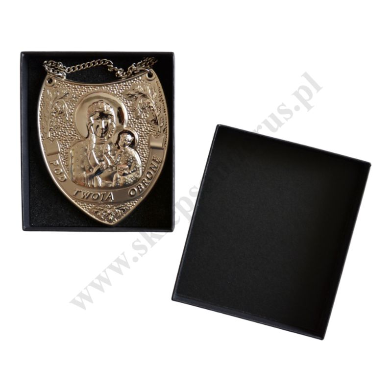 Ryngraf z wizerunkiem Matki Bożej Częstochowskiej wykonany z blachy mosiężnej niklowanej. Wysokość ryngrafu 11 cm (bez łańcuszka), szerokość 9.7 cm. Ryngraf zapakowany w tekturowe pudełeczko.