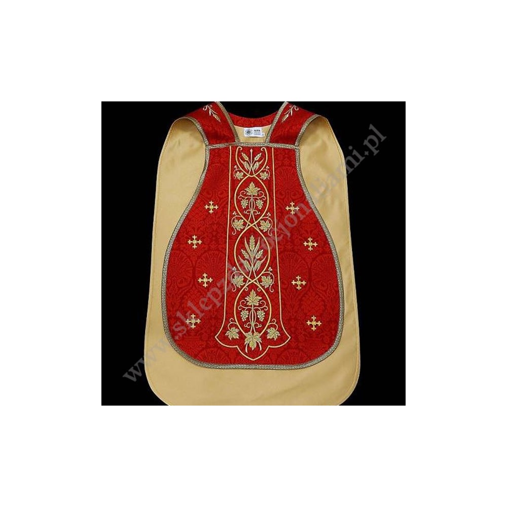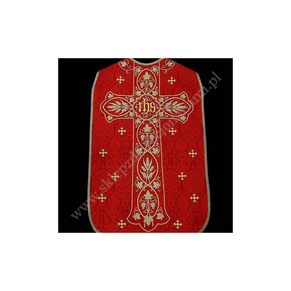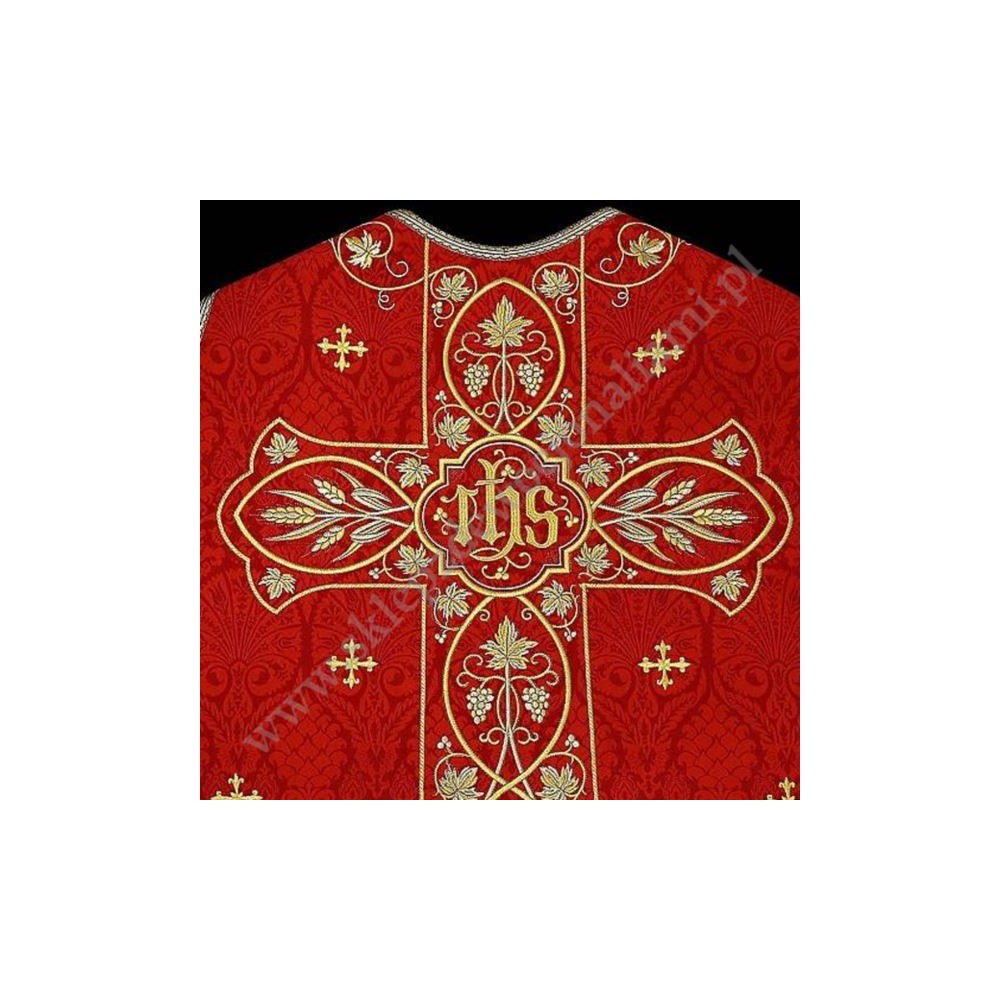 Ornat rzymski uszyty z ozdobnej tkaniny z bogatym haftem. Całość uzupełniona satynową podszewką, w komplecie stuła do ornatu.