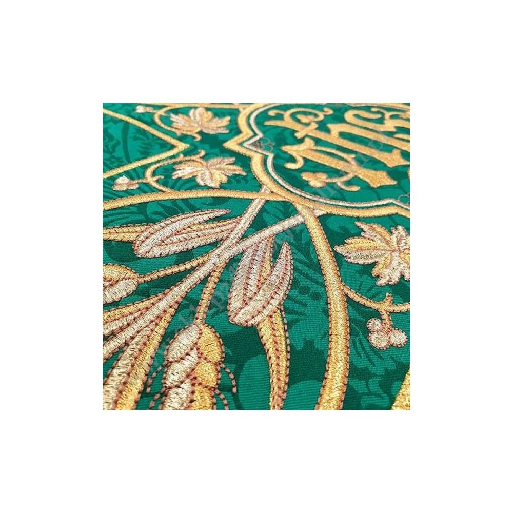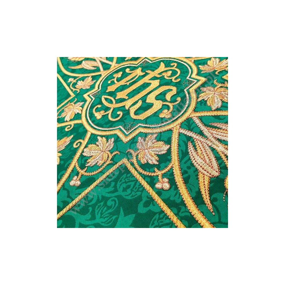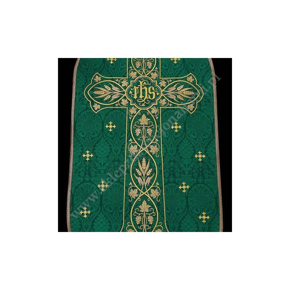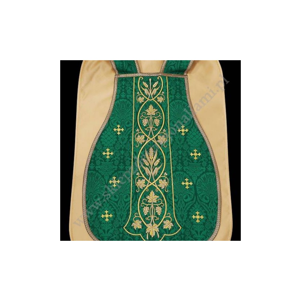 Ornat rzymski uszyty z ozdobnej tkaniny z bogatym haftem. Całość uzupełniona satynową podszewką, w komplecie stuła do ornatu.