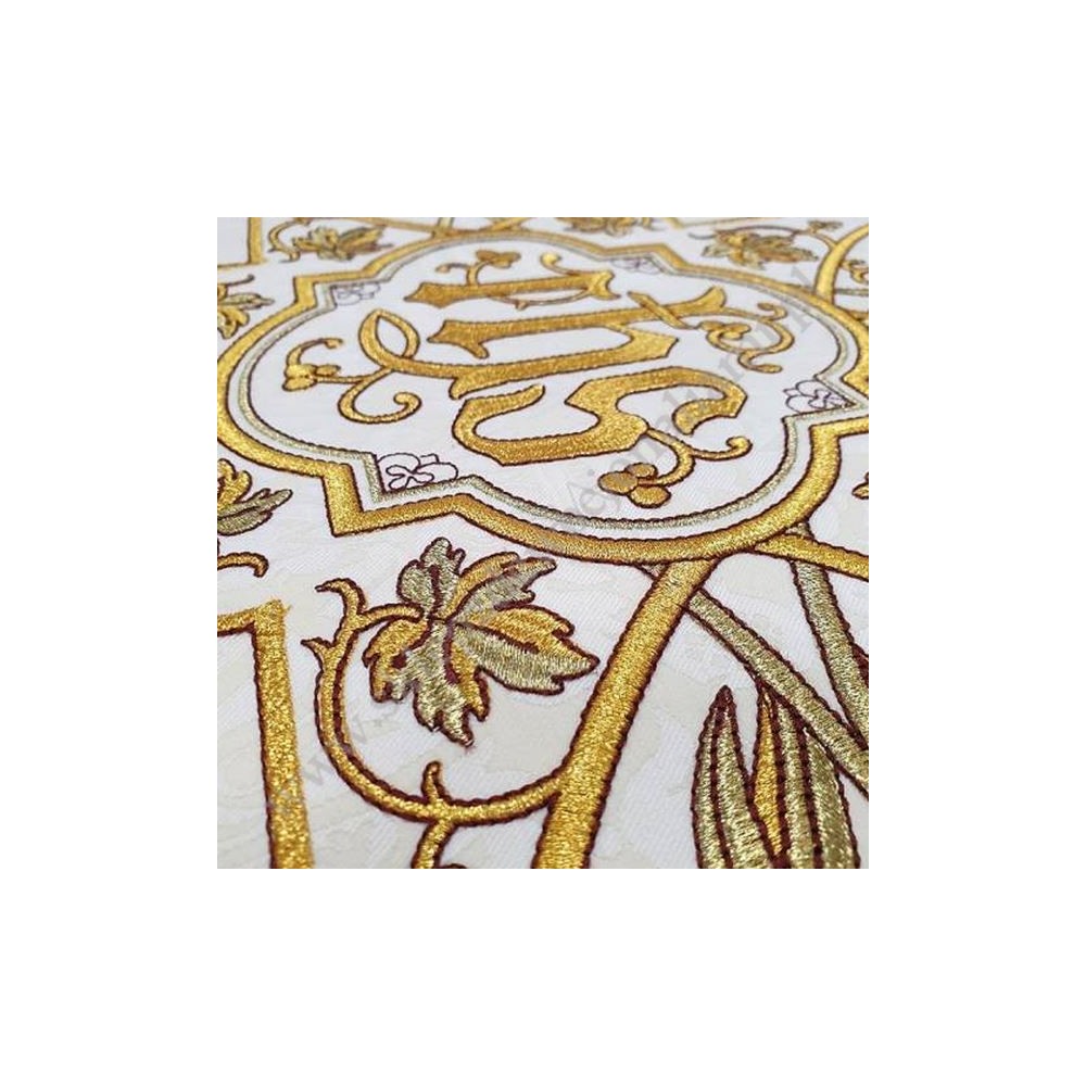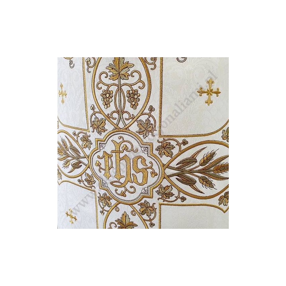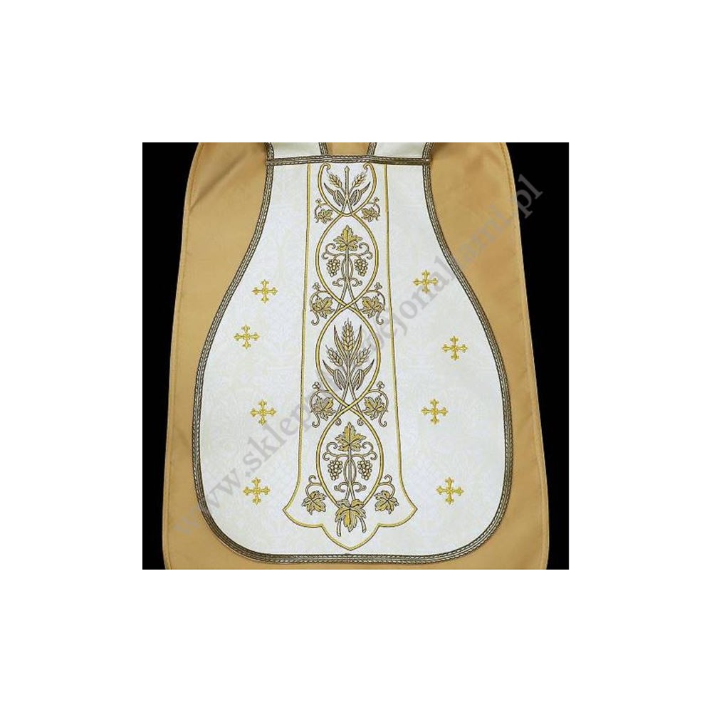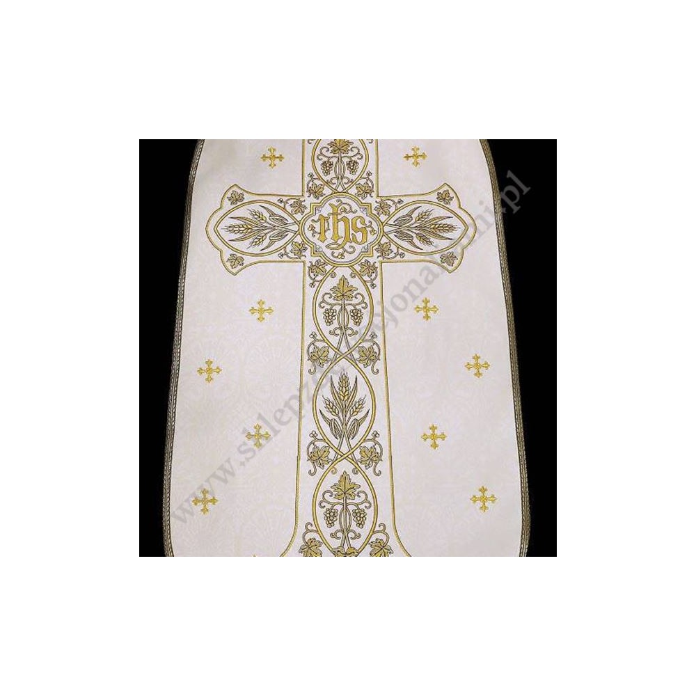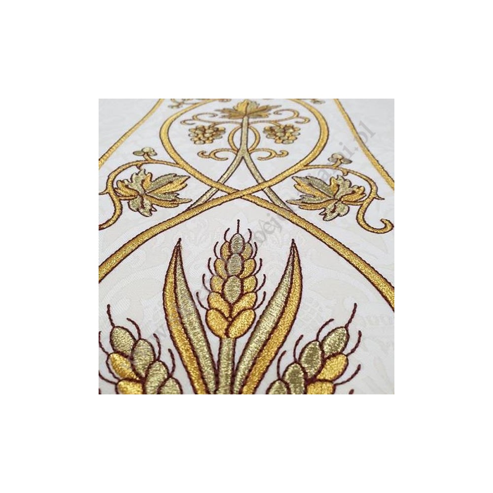 Ornat rzymski uszyty z ozdobnej tkaniny z bogatym haftem. Całość uzupełniona satynową podszewką, w komplecie stuła do ornatu.