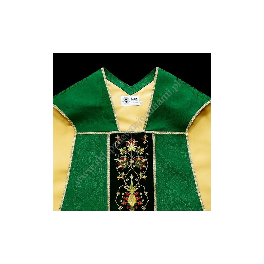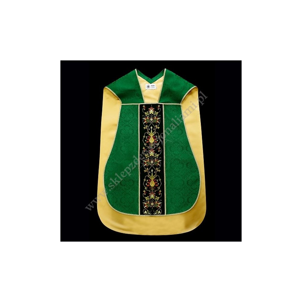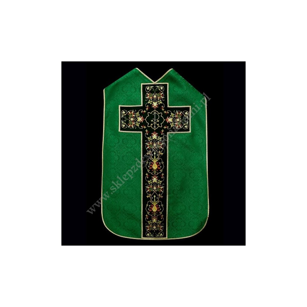 Ornat rzymski uszyty z ozdobnej tkaniny z bogatym haftem na aksamicie. Całość uzupełniona satynową podszewką, w komplecie stuła do ornatu.