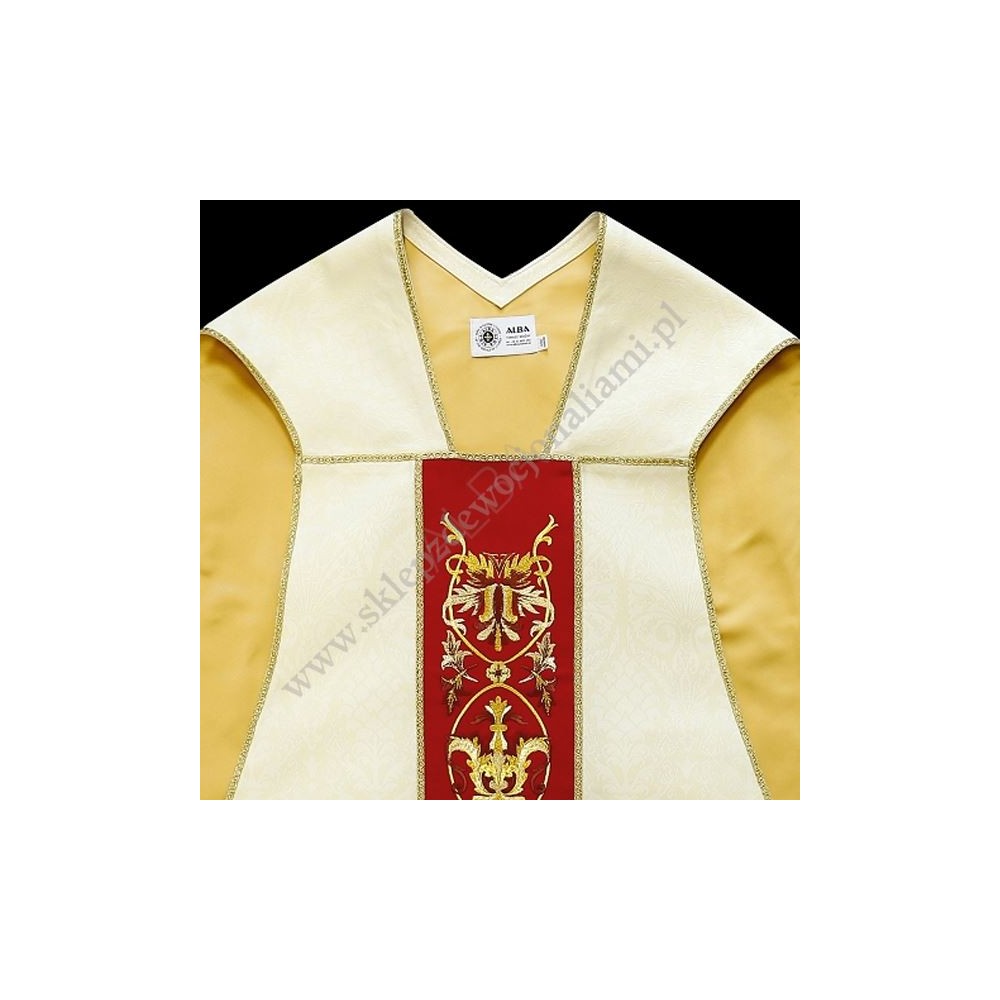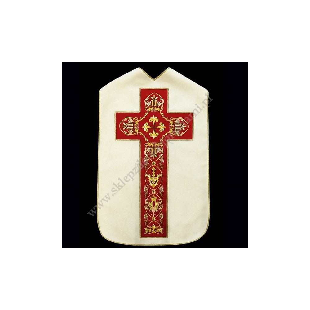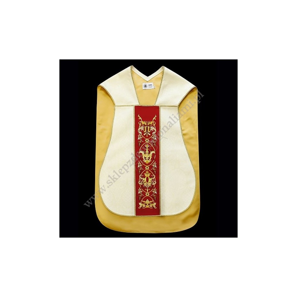 Ornat rzymski uszyty z ozdobnej tkaniny ozdobiony bogatym haftem na satynie. Całość uzupełniona satynową podszewką, w komplecie stuła do ornatu.