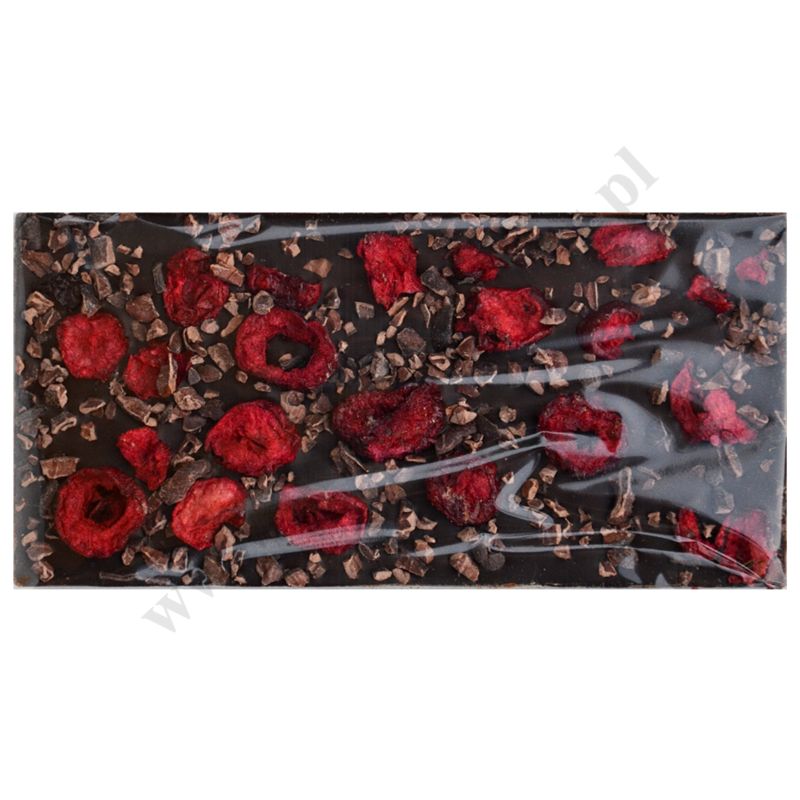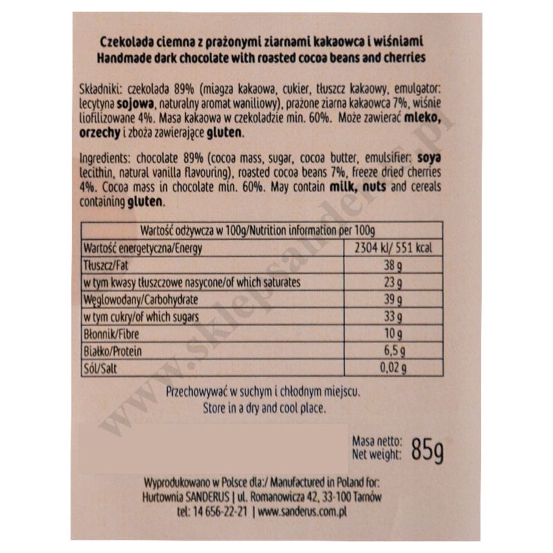 Czekolada ciemna z prażonymi ziarnami kakaowca i wiśniami, wykonana ręcznie z naturalnych składników, oryginalnie zapakowana.