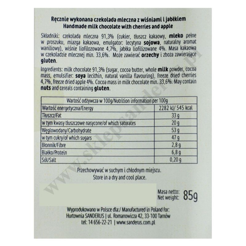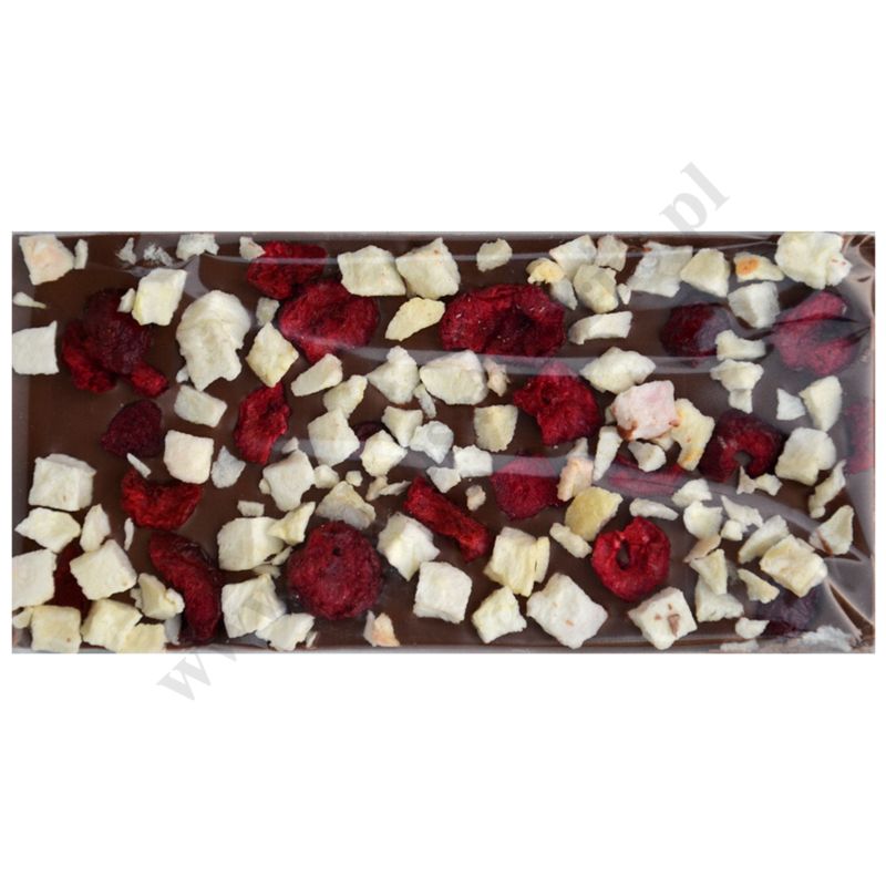 Czekolada mleczna z wiśniami i jabłkiem wykonana ręcznie z naturalnych składników, oryginalnie zapakowana.
