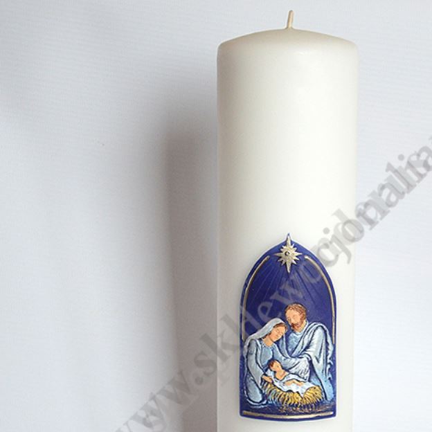 Świeca ołtarzowa na Boże Narodzenie o wysokości 30 cm i średnicy 7.5 cm, zdobiona przestrzenną aplikacją Świętej Rodziny.