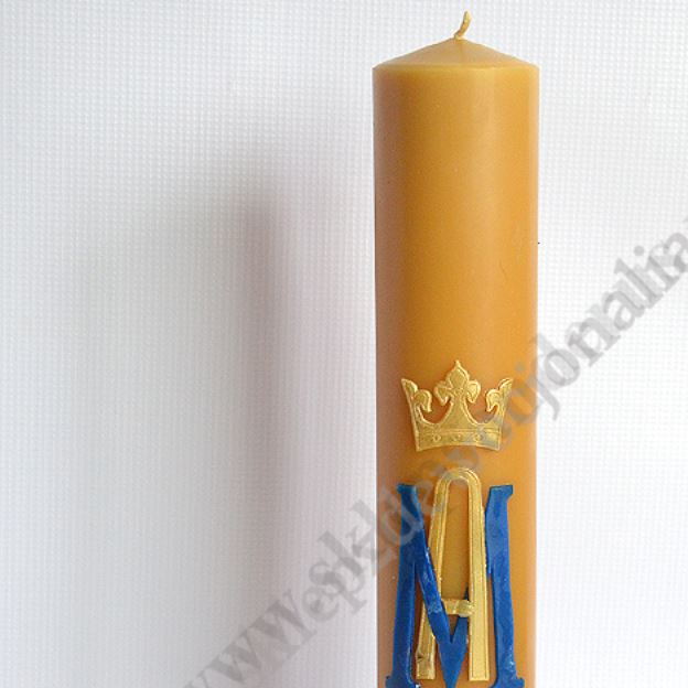 Świeca ołtarzowa spalana oblewana woskiem o wysokości 33 cm i średnicy 6.5 cm zdobiona przestrzenną aplikacja maryjną.