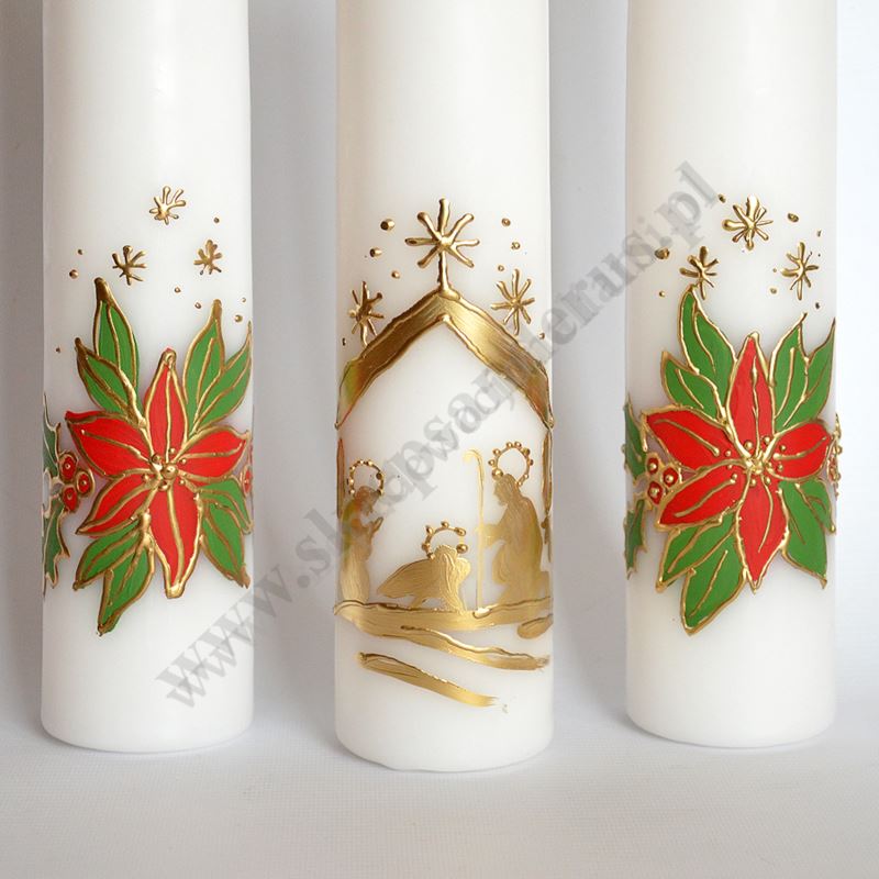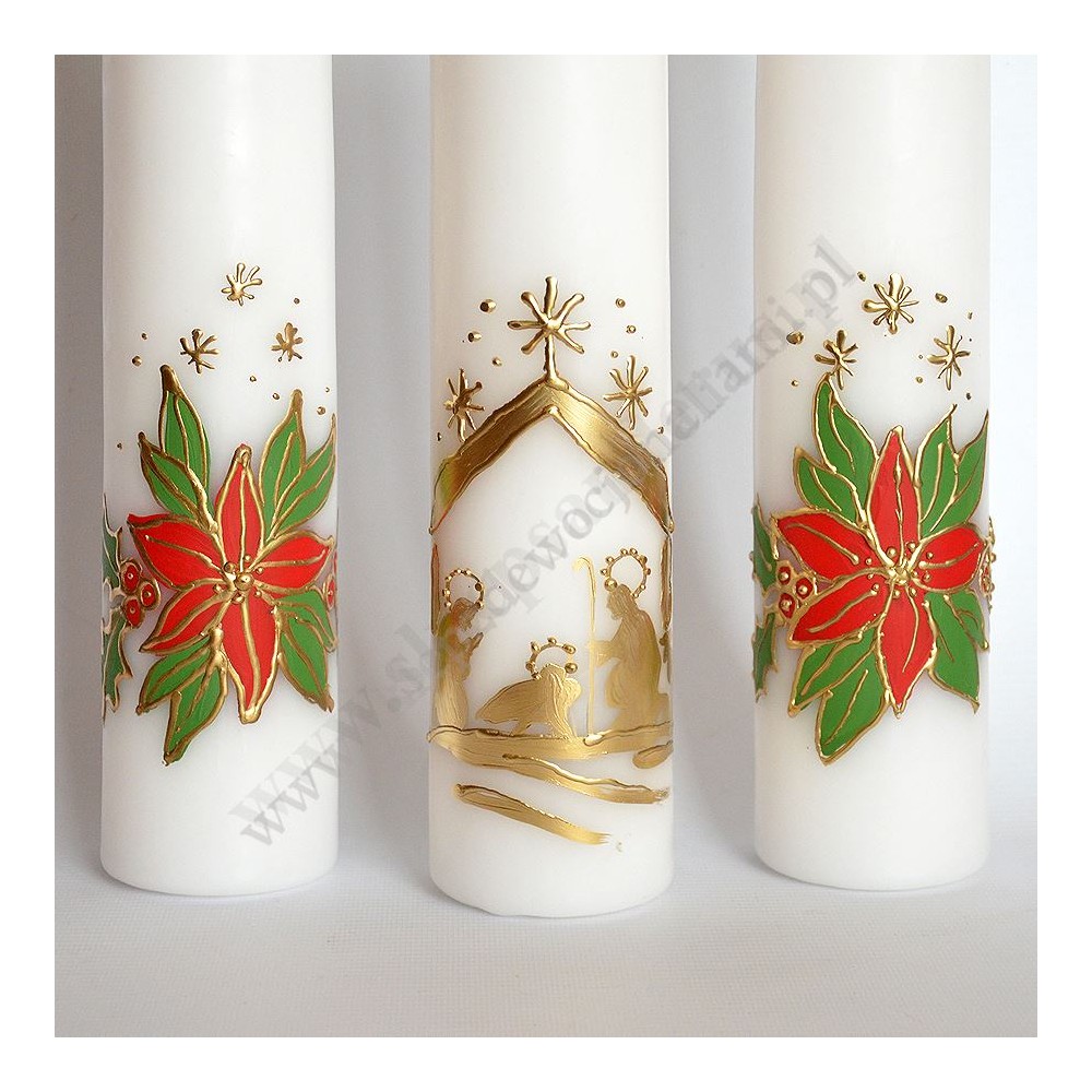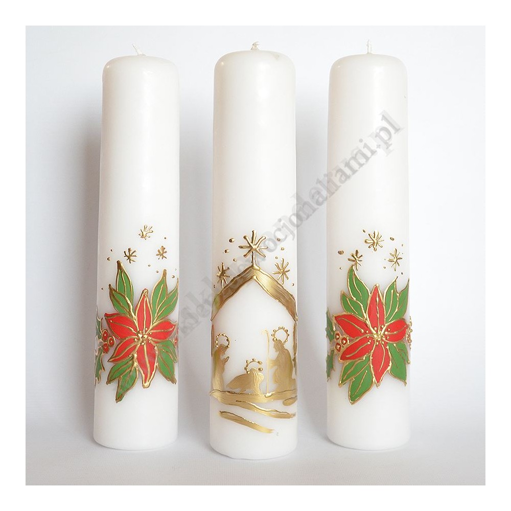 Komplet trzech świec ołtarzowych, parafinowych o wysokości 30 cm i średnicy 6.5 cm, ręcznie malowanych motywami bożonarodzeniowymi.