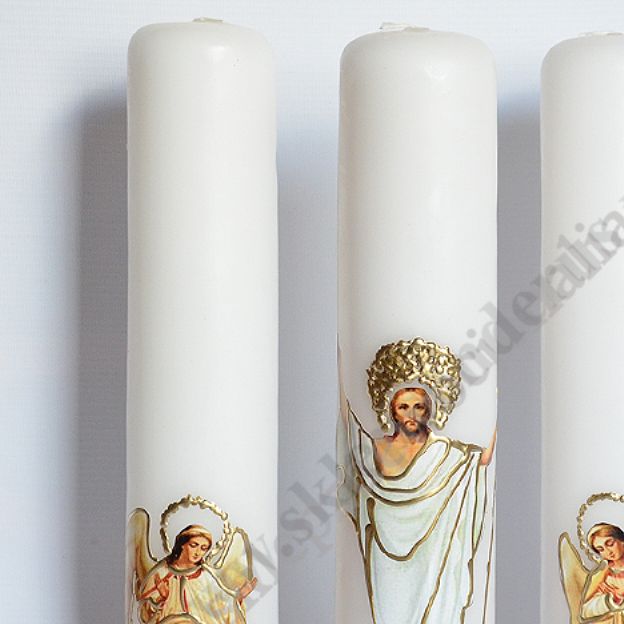 Komplet trzech świec spalanych parafinowych o charakterze wielkanocnym. Ręcznie zdobione wizerunkiem Pana Jezusa Zmartwychwstałego i aniołów. Wysokość świec 30 cm, średnica świec 6.7 cm.