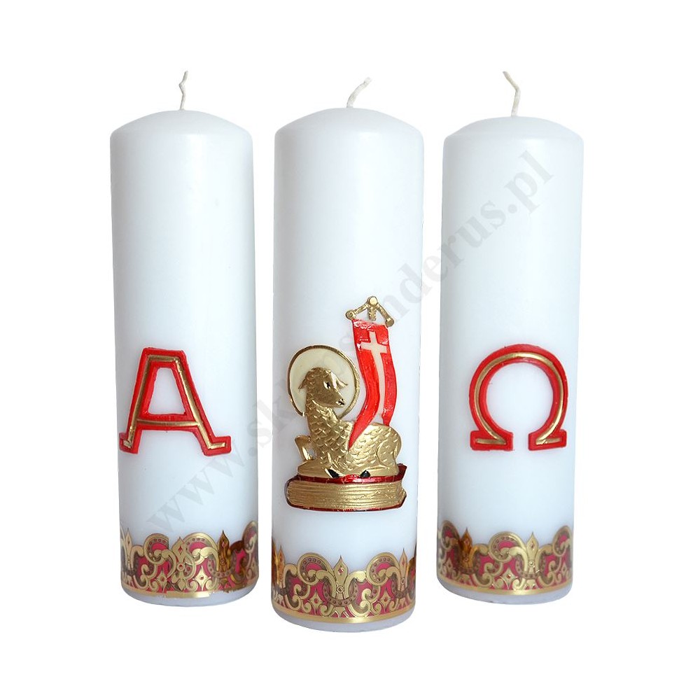 Komplet trzech świec parafinowych o wysokości 23 cm i średnicy 7 cm, zdobione wielkanocnymi aplikacjami.