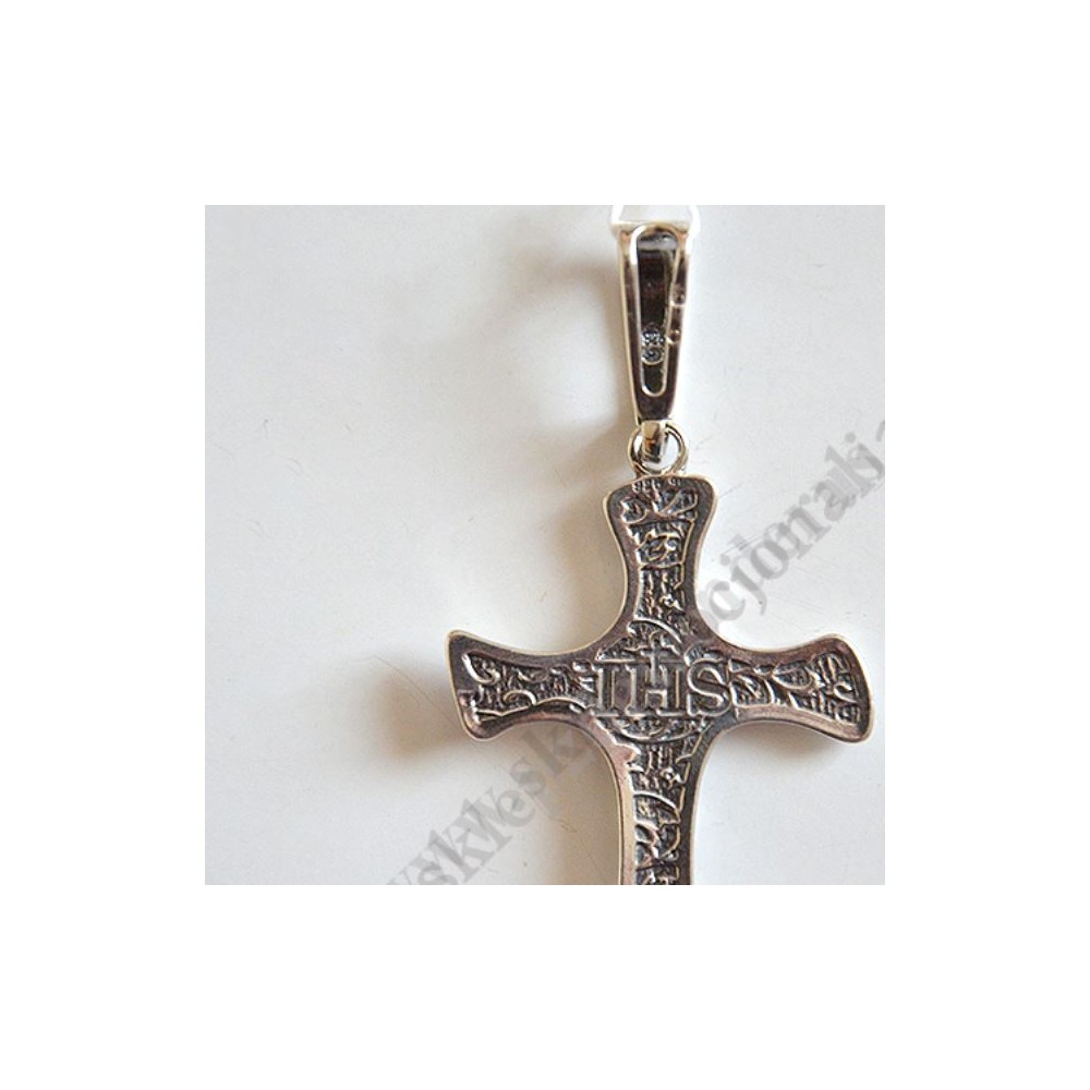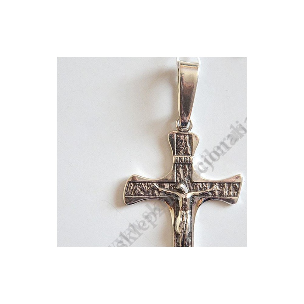 Srebrny krzyżyk o wysokości 7 cm (z koluszkiem), szerokości 3.5 cm, waga 8.2 g, próba srebra PR 925.