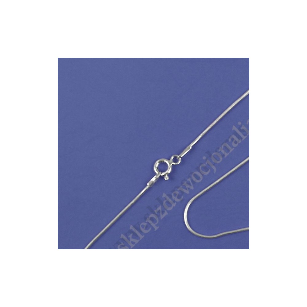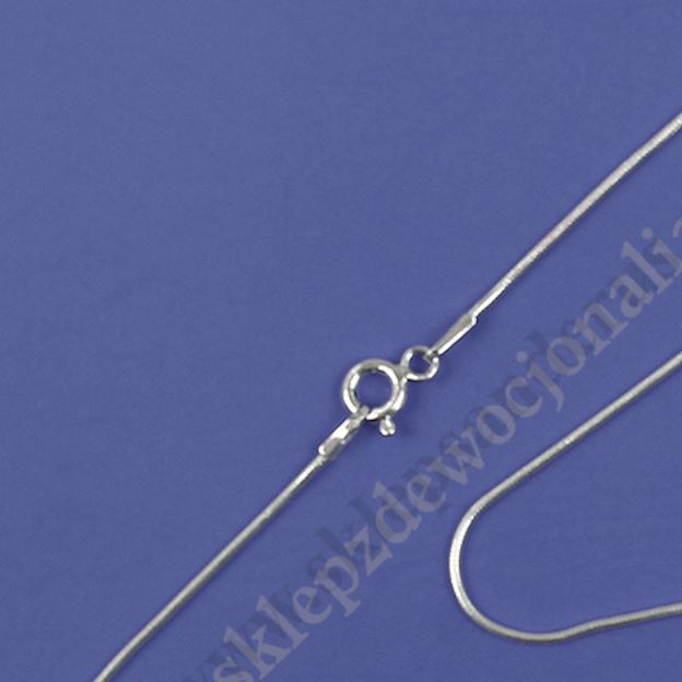 Srebrny łancuszek typu linka o długości 45 cm i szerokości 0.9 mm. Srebro próba 925, waga 3 g. Zapięcie typu federing.