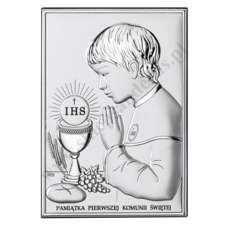 Srebrny obrazek przedstawiający chłopca przyjmującego I Komunię Świętą. Rozmiar obrazka 13 x 18 cm. PONIŻEJ W PRODUKTACH POWIĄZANYCH ISTNIEJE MOŻLIWOŚĆ ZAMÓWIENIA OKAZJONALNEJ DEDYKACJI NA TABLICZCE LUB REWERSIE OBRAZKA.