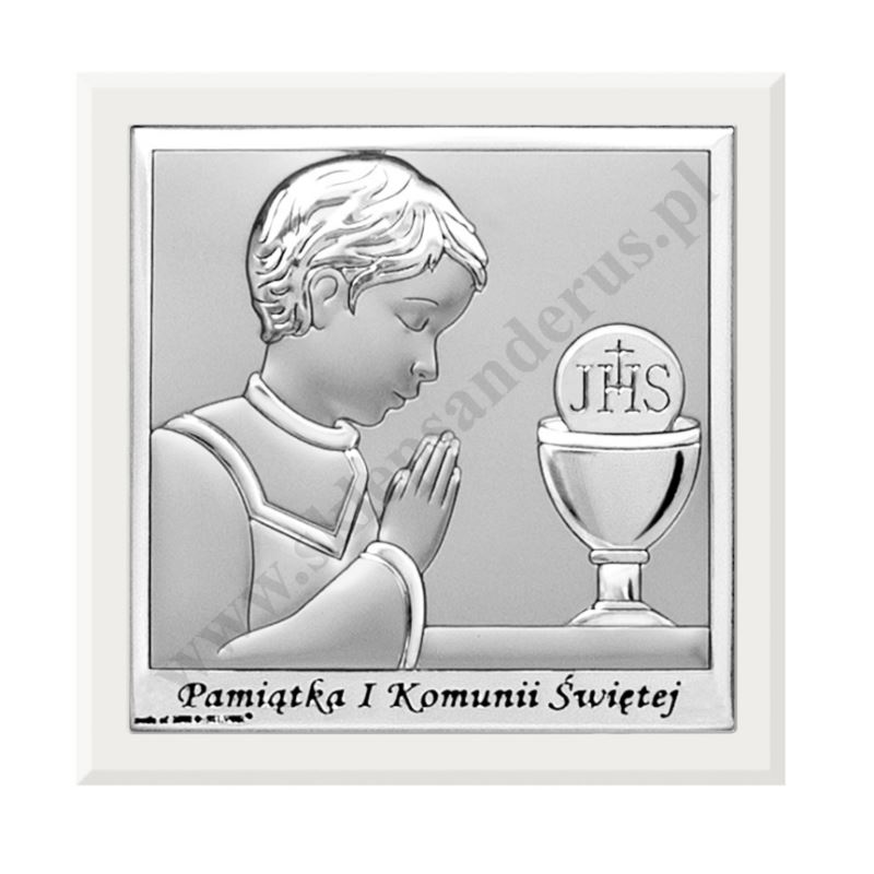 Srebrny obrazek przedstawiający chłopca przyjmującego I Komunię Świętą. Rozmiar obrazka 14 x 14 cm. PONIŻEJ W PRODUKTACH POWIĄZANYCH ISTNIEJE MOŻLIWOŚĆ ZAMÓWIENIA OKAZJONALNEJ DEDYKACJI NA TABLICZCE LUB REWERSIE OBRAZKA.