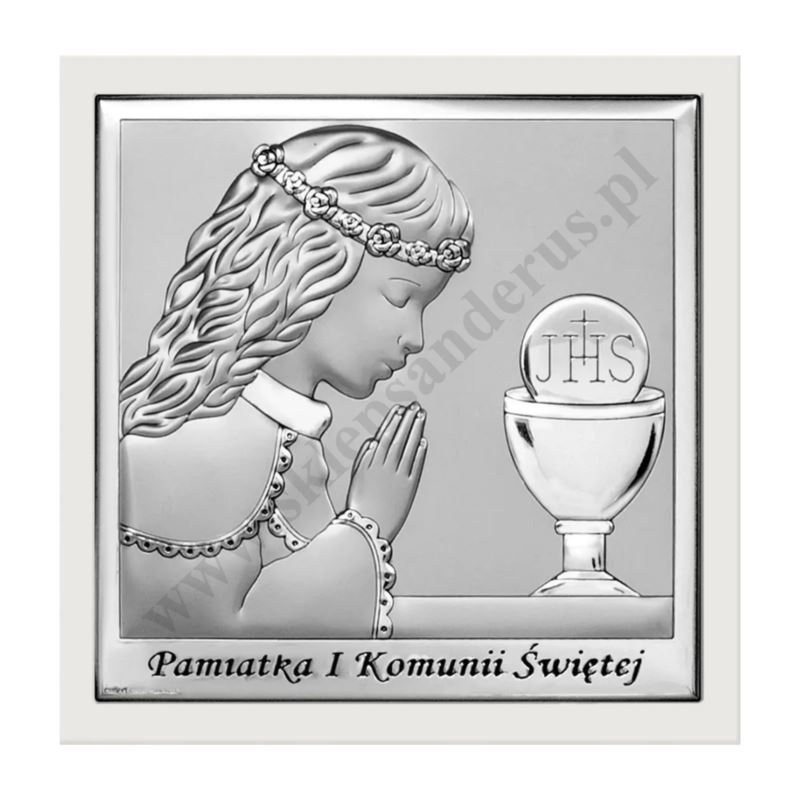 Srebrny obrazek przedstawiający dziewczynkę przyjmującą I Komunię Świętą. Rozmiar obrazka 14 x 14 cm. PONIŻEJ W PRODUKTACH POWIĄZANYCH ISTNIEJE MOŻLIWOŚĆ ZAMÓWIENIA OKAZJONALNEJ DEDYKACJI NA TABLICZCE LUB REWERSIE OBRAZKA.