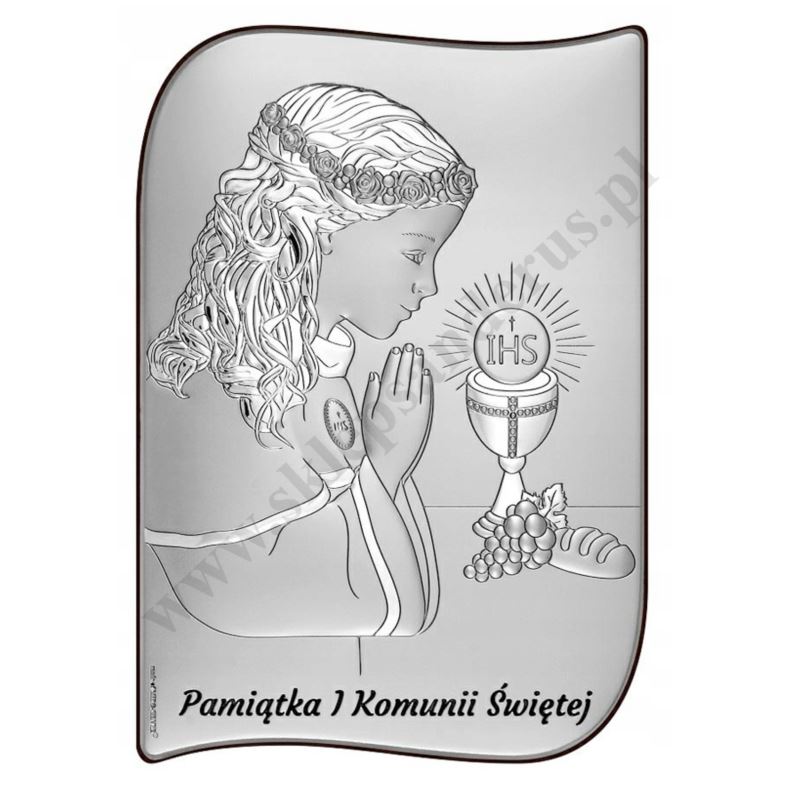 Srebrny obrazek przedstawiający dziewczynkę przyjmującą I Komunię Świętą. Rozmiar obrazka 14.5 x 21 cm. PONIŻEJ W PRODUKTACH POWIĄZANYCH ISTNIEJE MOŻLIWOŚĆ ZAMÓWIENIA OKAZJONALNEJ DEDYKACJI NA TABLICZCE LUB REWERSIE OBRAZKA.