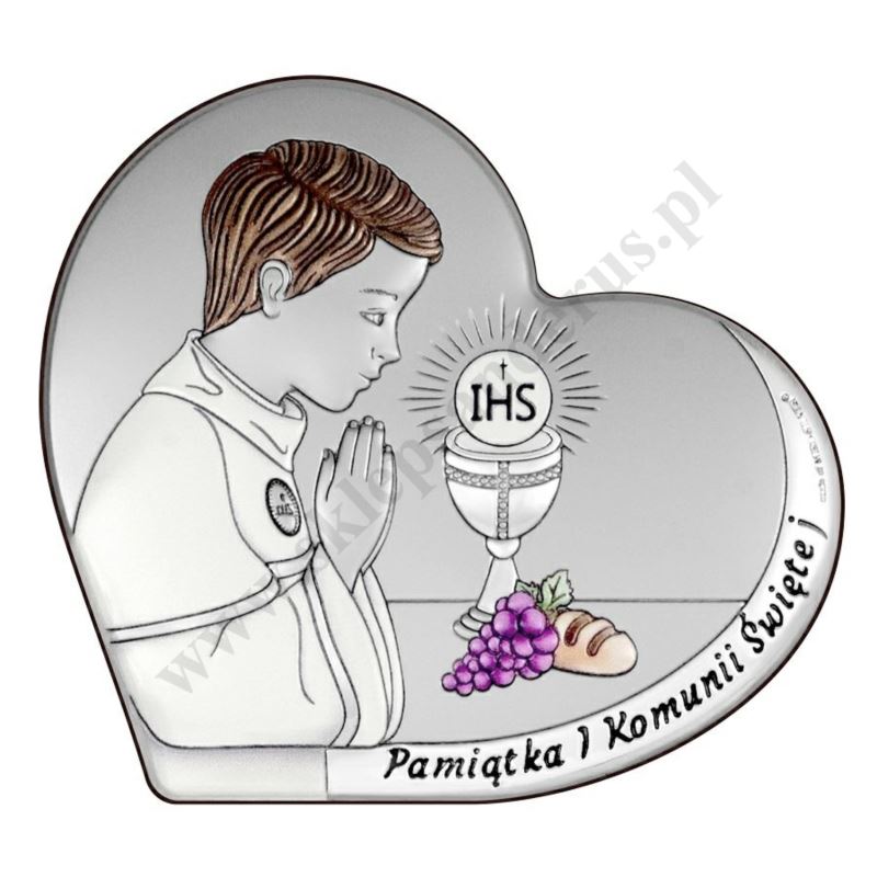 Srebrny obrazek, koloryzowany przedstawiający chłopca przyjmującego I Komunię Świętą. Rozmiar obrazka 15.5 x 14 cm. PONIŻEJ W PRODUKTACH POWIĄZANYCH ISTNIEJE MOŻLIWOŚĆ ZAMÓWIENIA OKAZJONALNEJ DEDYKACJI NA TABLICZCE LUB REWERSIE OBRAZKA.