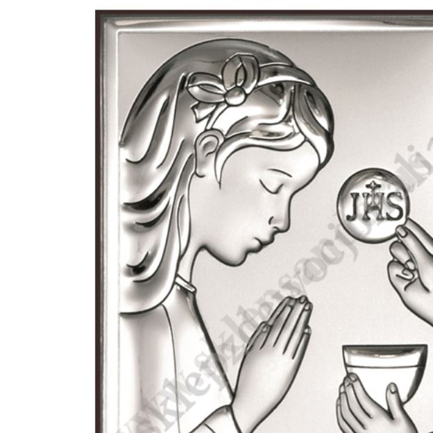 Srebrny obrazek przedstawiający dziewczynkę przyjmującą I Komunię Świętą. Rozmiar obrazka 9 x 13 cm. PONIŻEJ W PRODUKTACH POWIĄZANYCH ISTNIEJE MOŻLIWOŚĆ ZAMÓWIENIA OKAZJONALNEJ DEDYKACJI NA TABLICZCE LUB REWERSIE OBRAZKA.