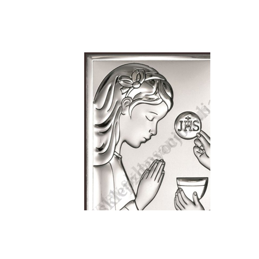 Srebrny obrazek przedstawiający dziewczynkę przyjmującą I Komunię Świętą. Rozmiar obrazka 9 x 13 cm.
