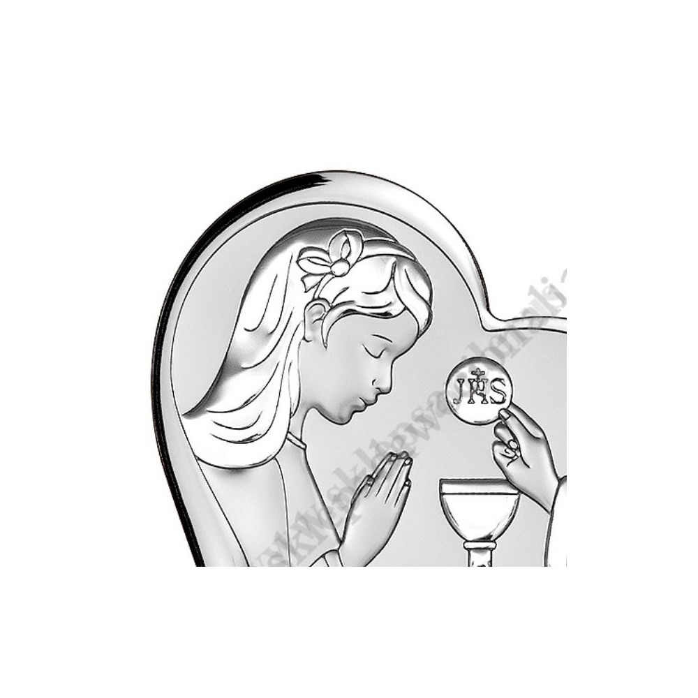 Srebrny obrazek przedstawiający dziewczynkę przyjmującą I Komunię Świętą. Rozmiar obrazka 15.3 x 14.1 cm. PONIŻEJ W PRODUKTACH POWIĄZANYCH ISTNIEJE MOŻLIWOŚĆ ZAMÓWIENIA OKAZJONALNEJ DEDYKACJI NA TABLICZCE LUB REWERSIE OBRAZKA.