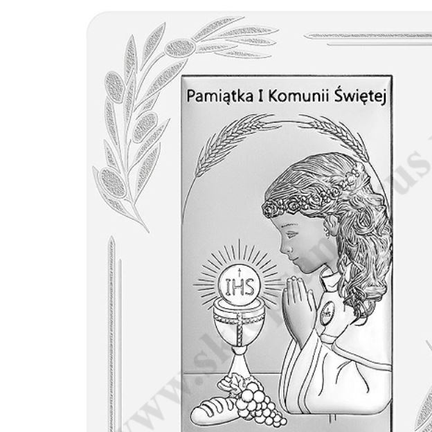 Srebrny obrazek przedstawiający dziewczynkę przyjmującą I Komunię Świętą. Rozmiar obrazka 9.5 x 13 cm. PONIŻEJ W PRODUKTACH POWIĄZANYCH ISTNIEJE MOŻLIWOŚĆ ZAMÓWIENIA OKAZJONALNEJ DEDYKACJI NA TABLICZCE LUB REWERSIE OBRAZKA.