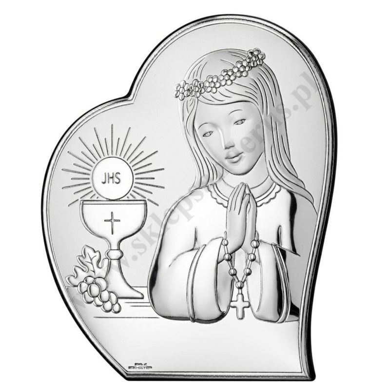 Srebrny obrazek przedstawiający dziewczynkę przyjmującą I Komunię Świętą. Rozmiar obrazka 9 x 11 cm. PONIŻEJ W PRODUKTACH POWIĄZANYCH ISTNIEJE MOŻLIWOŚĆ ZAMÓWIENIA OKAZJONALNEJ DEDYKACJI NA TABLICZCE LUB REWERSIE OBRAZKA.