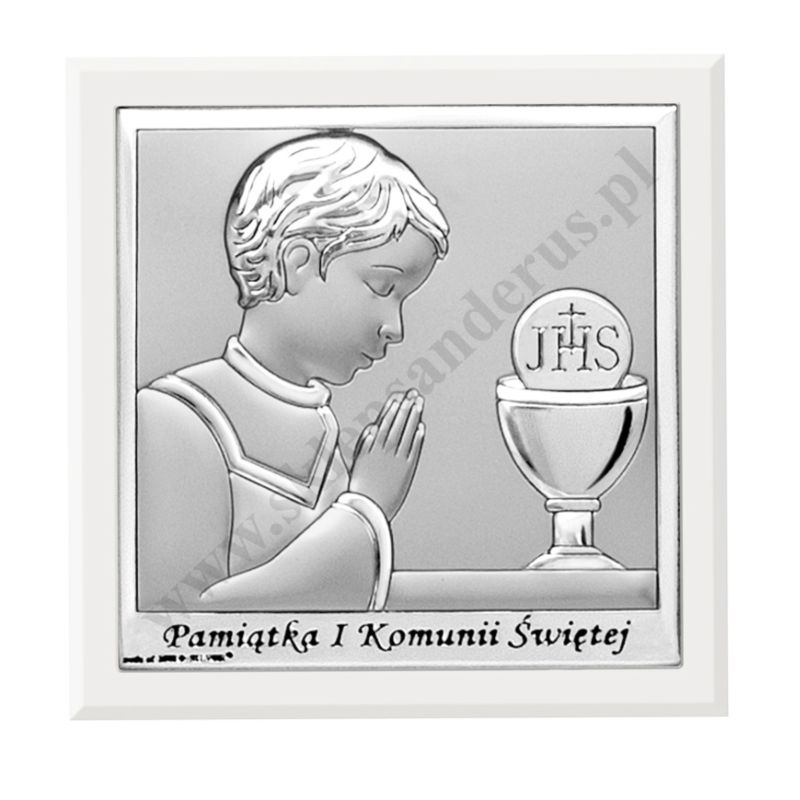 Srebrny obrazek przedstawiający chłopca przyjmującego I Komunię Świętą. Rozmiar obrazka 10 x 10 cm. PONIŻEJ W PRODUKTACH POWIĄZANYCH ISTNIEJE MOŻLIWOŚĆ ZAMÓWIENIA OKAZJONALNEJ DEDYKACJI NA TABLICZCE LUB REWERSIE OBRAZKA.