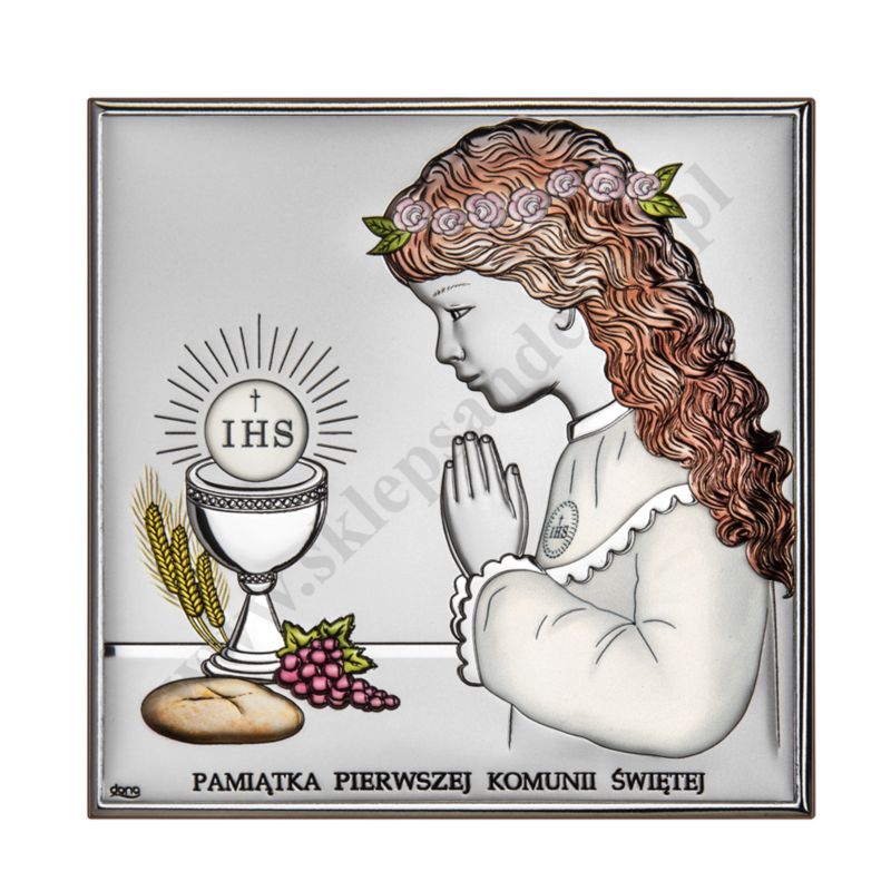Srebrny, koloryzowany obrazek przedstawiający dziewczynkę przyjmującą I Komunię Świętą. Rozmiar obrazka 11 x 11 cm. PONIŻEJ W PRODUKTACH POWIĄZANYCH ISTNIEJE MOŻLIWOŚĆ ZAMÓWIENIA OKAZJONALNEJ DEDYKACJI NA TABLICZCE LUB REWERSIE OBRAZKA.