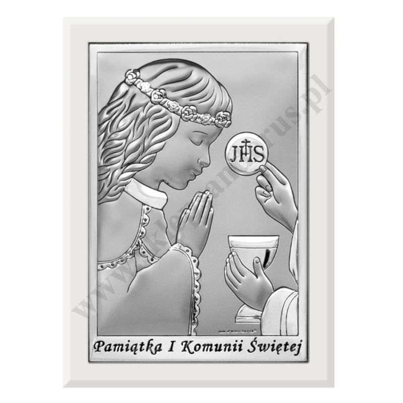 Srebrny obrazek przedstawiający dziewczynkę przyjmującą I Komunię Świętą. Rozmiar obrazka 11 x 15 cm. Obrazek posrebrzany przy użyciu technologii PVD (miro-silver) z napisem na emblemacie na białym drewnie.