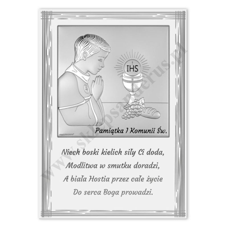 Srebrny obrazek przedstawiający chłopca przyjmującego I Komunię Świętą na drewnianej stylizowanej desce. Rozmiar obrazka 15 x 21 cm. PONIŻEJ W PRODUKTACH POWIĄZANYCH ISTNIEJE MOŻLIWOŚĆ ZAMÓWIENIA OKAZJONALNEJ DEDYKACJI NA TABLICZCE LUB REWERSIE OBRAZKA.
