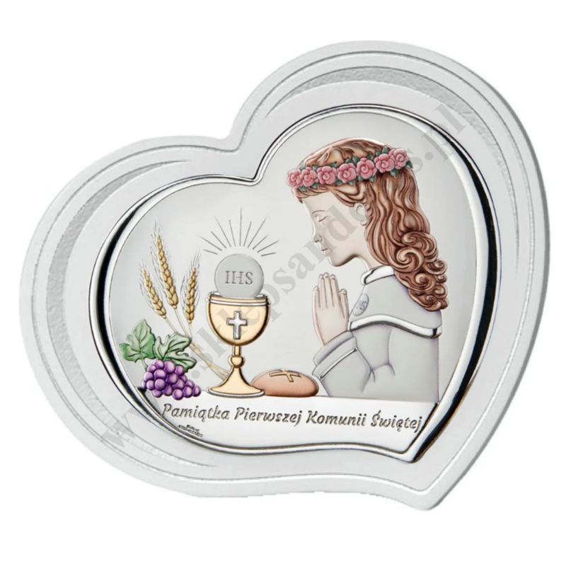 Srebrny, koloryzowany obrazek przedstawiający dziewczynkę przyjmującą I Komunię Świętą. Rozmiar obrazka 19 x 16 cm. Obrazek posrebrzany przy użyciu technologii PVD (miro-silver) z napisem na emblemacie na białym panelu ze srebrnym zdobieniem.