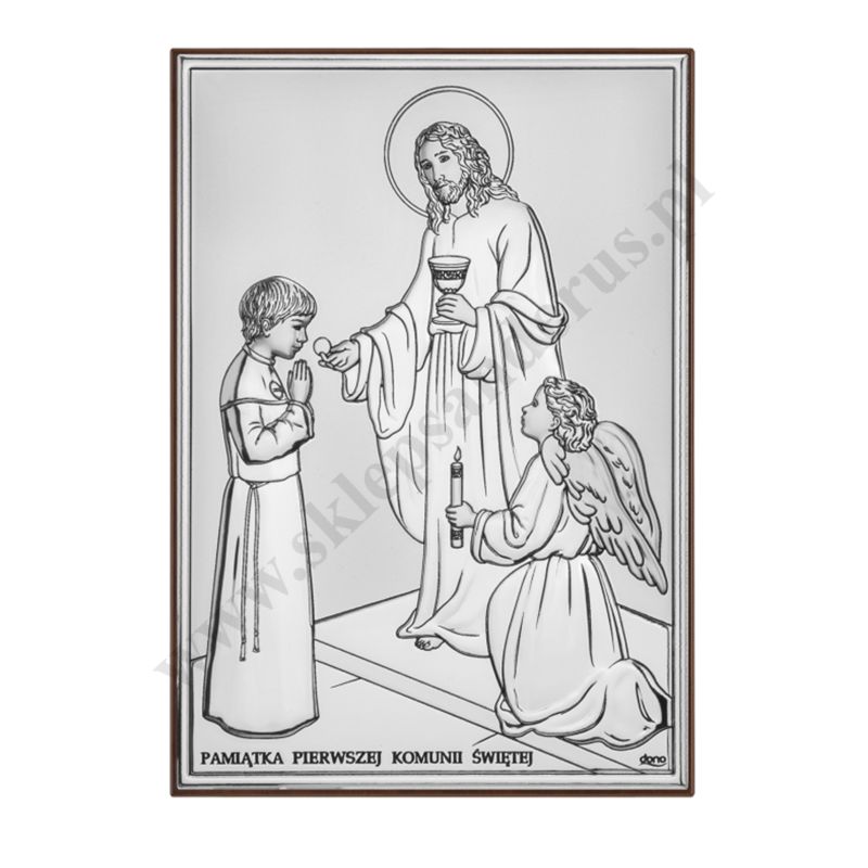 Srebrny obrazek przedstawiający Pana Jezusa udzielającego chłopcu I Komunię Świętą. Rozmiar obrazka 7 x 10 cm. PONIŻEJ W PRODUKTACH POWIĄZANYCH ISTNIEJE MOŻLIWOŚĆ ZAMÓWIENIA OKAZJONALNEJ DEDYKACJI NA TABLICZCE LUB REWERSIE OBRAZKA.