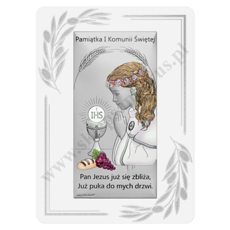 Srebrny obrazek, koloryzowany przedstawiający dziewczynkę przyjmującą I Komunię Świętą. Rozmiar obrazka 9.5 x 13 cm. PONIŻEJ W PRODUKTACH POWIĄZANYCH ISTNIEJE MOŻLIWOŚĆ ZAMÓWIENIA OKAZJONALNEJ DEDYKACJI NA TABLICZCE LUB REWERSIE OBRAZKA.